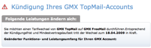 Jahrelange Treue, einmal schwach geworden und einen TOP-Mail Account (wegen der Fax-Funktion) für 3-Monate-kostenlos abbonniert. Jetzt Frist ohne Ankündigung verpasst. Zack, sofort jeden Monat um Geld erleichtert. VERDAMMT – ich könnt in die Tischkante beissen für meine eigene Dummheit – diese Email-Provider sind schlimmer als die GEZ und elendige 24-Monatsverträge der Mobilfunkanbieter zusammen.